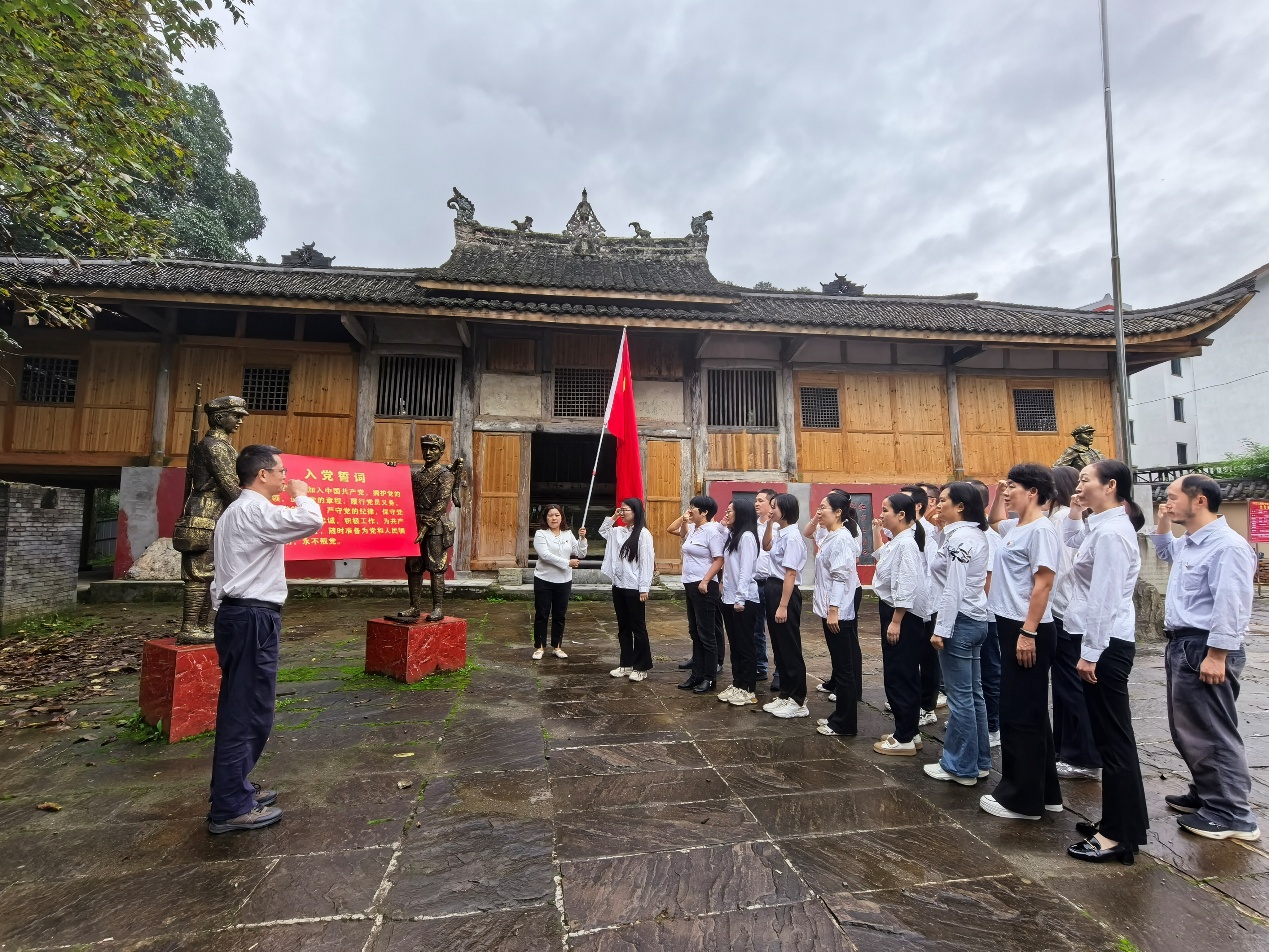 在当地讲解员的带领下,党员们前往平南苏维埃旧址核心区域,认真聆听红军 “建立平南苏维埃政权”“保护群众财产” 等革命故事,沉浸式感受 “军民同心、顽强抗争” 的长征精神与抗战精神交融的红色力量。随后,全体党员在苏维埃旧址标志性的红军标语墙前整齐列队。高举右拳,在领誓人的带领下庄严重温入党誓词。铿锵有力的誓言与墙上的红色标语交相辉映,不仅是对革命先辈的深切缅怀,更是对初心使命的郑重承诺。
